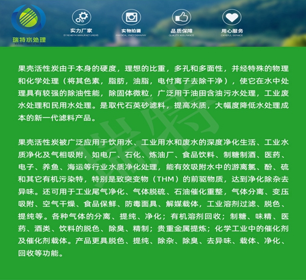 以上果殼活性炭產(chǎn)品信息由鞏義市瑞特水處理材料技術(shù)部編輯提供,轉(zhuǎn)載請說明文章出自鞏義瑞特水處理。