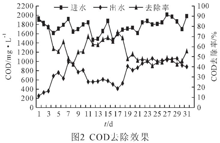 實(shí)驗(yàn)結(jié)果與分析。反應(yīng)器啟動(dòng)成功后,逐步提高進(jìn)水的濃度,不再添加葡萄糖和氮磷營(yíng)養(yǎng)液,完全采用電催化氧化處理后的農(nóng)藥廢水,調(diào)節(jié)pH值為7.5左右,在HRT=4h、回流量滿足果殼活性炭成流化狀態(tài)下運(yùn)行。